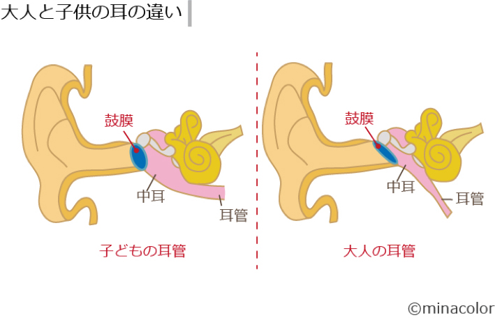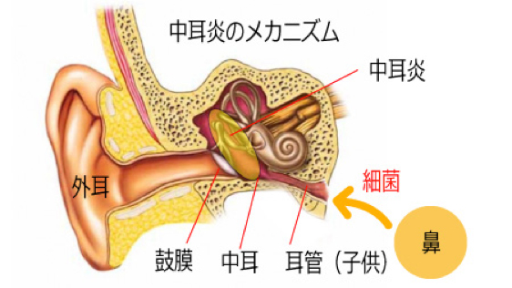 菌が、耳の外からではなく、鼻の奥から入ってきます。 プールやお風呂の水が耳に入って中耳炎になることはありません。主にカゼがきっかけで鼻に増えた菌が、耳へ入って中耳炎を起こします。小さいうちは、しょっちゅう鼻カゼをひくので、カゼから中耳炎をよく引き起こします。子どもがよく中耳炎になるのは、カゼをひきやすいことと、管の仕組みが関係しています。子どもの耳の管(耳管)は大人と比べ、太く短く、傾きも水平に近いので、菌が耳に入りやすいからです。