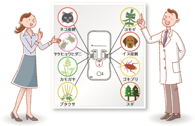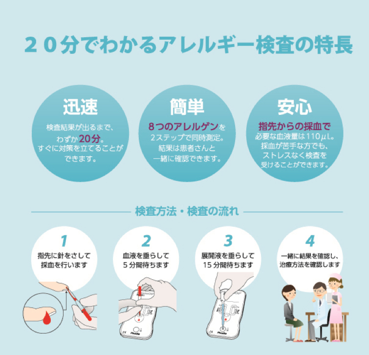 血液検査では何の抗原に反応しているかを調べることができます。また当院では指先から少量の血液を採取するだけで、約20分後には判定結果がわかる抗原検査(イムノキャップラピッド®)を導入しております。採血が苦手なお子様はもちろんのこと、大人の方にも気軽に受けて頂けると思います。アレルギー疾患の治療の基本は原因抗原除去・回避と薬物医療です。当院では、20分で結果がわかるアレルギー検査を導入しています。アレルギー性結膜炎、花粉症(アレルギー性鼻炎)、の主な原因となる8項目のアレルゲンに対する反応が一度に目で見てわかる検査です。指先から少量の血液を採取し、20分待つだけでその場で結果がわかります。